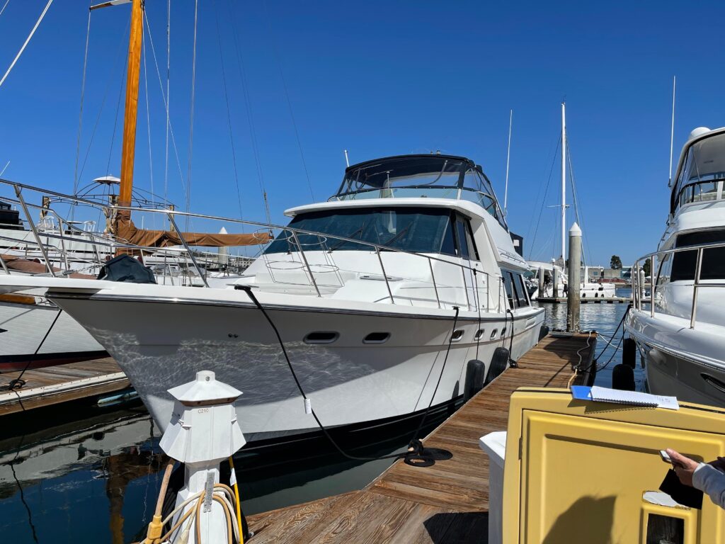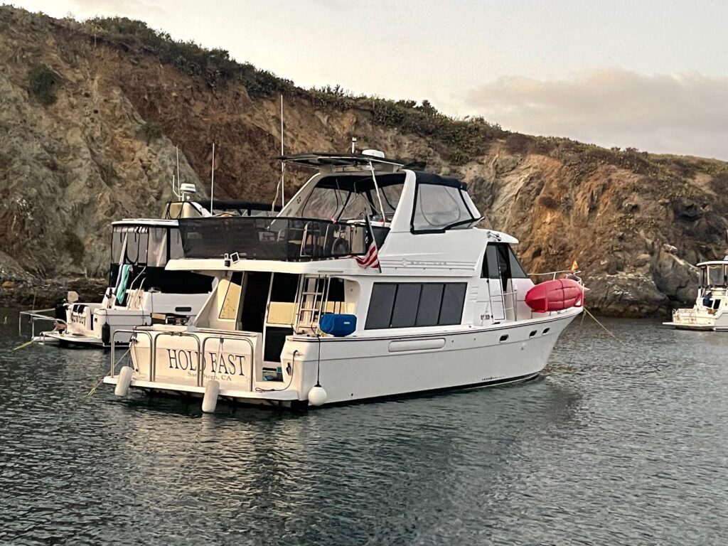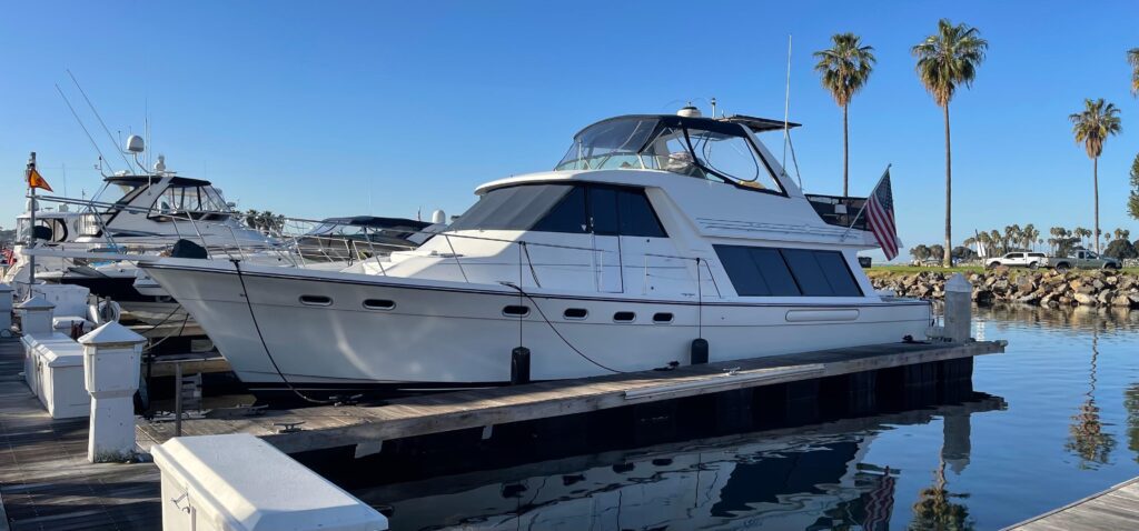HOLD FAST has been well cared for and comes with many NEW extras – Custom mounted solar panels (2/350 watt), new bimini (canvas & insinglass), new flybridge upholstery, all new Garmin electronics (chartplotter, radome, autopilot) new Fusion stereo (new speakers and amp) new salon tv, new salon shades/blinds, new LED bulbs throughout entire vessel, new freshwater pump, new galley faucet, new shower heads, ring security cameras (forward, aft & salon), new Bennet auto trim tab control, new bilge pumps (aft, mid and forward), new transom shower and dockside water adopter. New Rule shower/sink drain box w/ pump