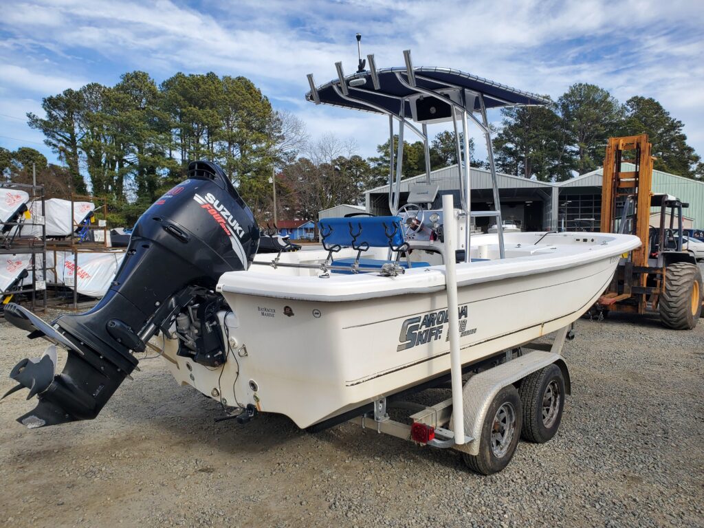 2008 CAROLINA SKIFF 218 DLV WITH A 2008 SUZUKI 140 HP WITH 615 HOURS AND A LOAD RITE ALUMINUM BUNK TRAILER ALUMINUM T TOP AND A GARMIN 840 XS DEPTHFINDER/ FISFINDER /GPS
