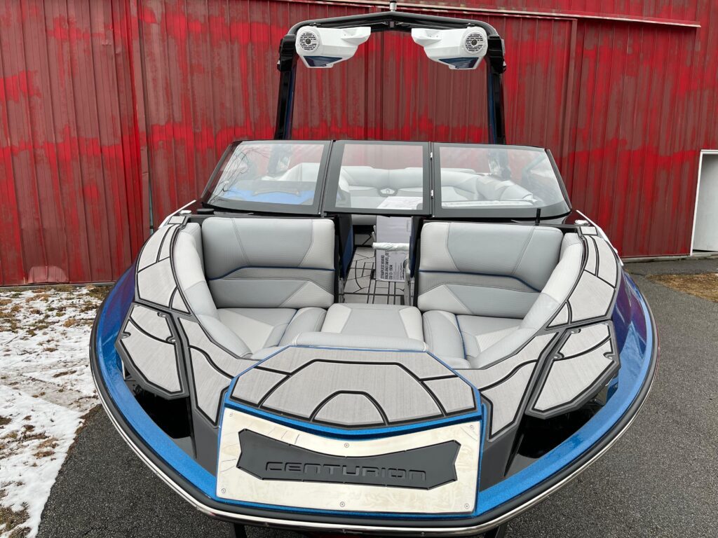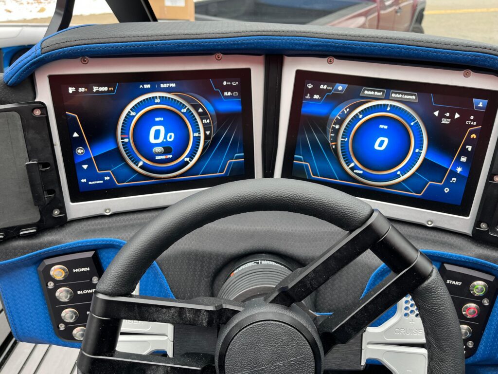 The Centurion Ri230 is best of both Worlds thanks in large part to the Opti-V running surface. The balance of Centurion Opti-V Hull includes a hook under the Ri230, which changes the running attitude of the boat to get the nose down and the entire “v” of the running surface cutting through chop and/or displacing water for wake surfing and wakeboarding. The available QuickSurf Pro Surf System consists of long stainless-steel blades on the rear corners of the boat branded with the Centurion Warrior to create lift opposite the surf side. This creates more water displacement on the surf corner for a wide range of surf wave adjustment. The Ri230 performance also benefits from 7 independently filled and drained ballast areas placed evenly throughout the boat. They combine for as much as 5850 pounds of ballast from the factory. Available RAMFILL2 or “Baller Ballast” accounts for more than half of the Ri230s ballast and fills in 90 seconds thanks to fill and drain gates comprised of 2″ stainless steel ball valves. RAMFILL2 combines high performance with the extreme reliability of ball valves, typically reserved for yacht fuel systems. All of this wake surfing performance combines to allow the Ri230 to manage fuel with more than 50% better efficiency than competitors. Don’t take our word for it. Opt for the Range of View (ROV) screen and monitor your Ri230’s surroundings as well as trip data and fuel usage.