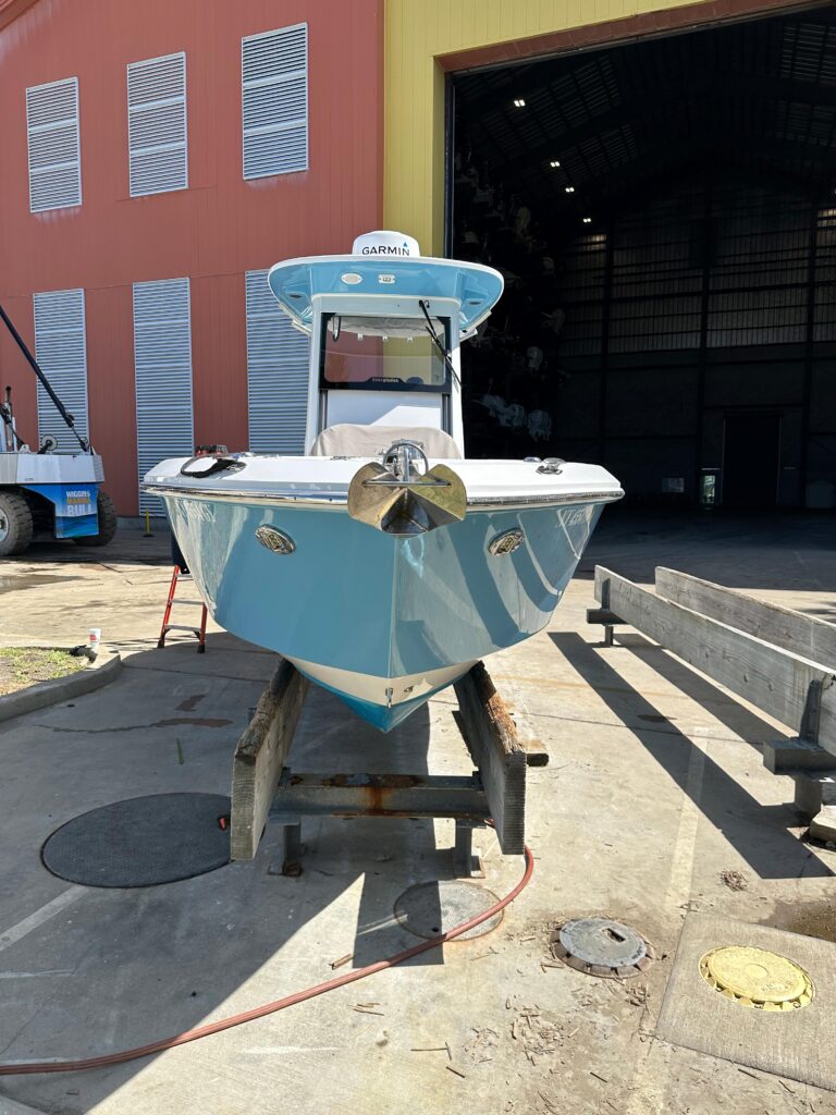 5 Series signature features include Everglades’ patented hydraulic sliding windshield, an oversized dash for electronics, a combination helm seat/leaning post, plush forward console seating, an ergonomically designed workstation, and a 65-quart, sliding Yeti cooler. Additional standard details include 8″ stainless steel pull-up cleats, powder-coated toe rails, and a lockable transom gate with freeing port. The electrically actuated aft seat/hatch provides easy bilge access, a welcome addition on a boat this size.