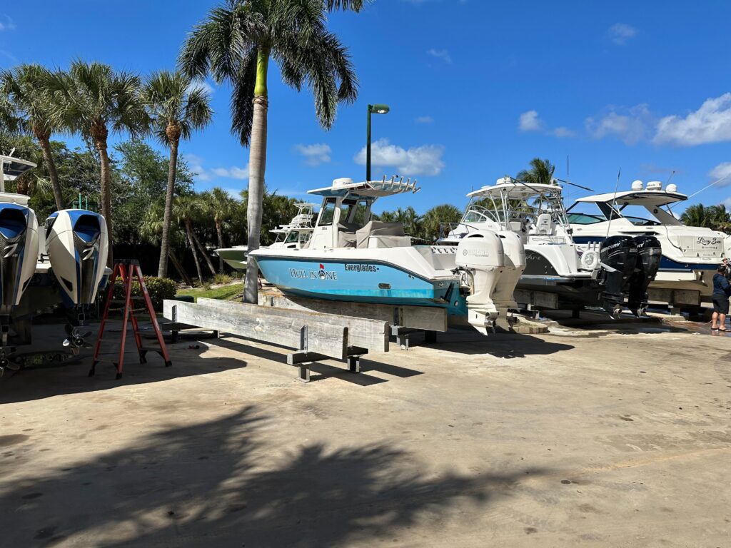 5 Series signature features include Everglades’ patented hydraulic sliding windshield, an oversized dash for electronics, a combination helm seat/leaning post, plush forward console seating, an ergonomically designed workstation, and a 65-quart, sliding Yeti cooler. Additional standard details include 8″ stainless steel pull-up cleats, powder-coated toe rails, and a lockable transom gate with freeing port. The electrically actuated aft seat/hatch provides easy bilge access, a welcome addition on a boat this size.