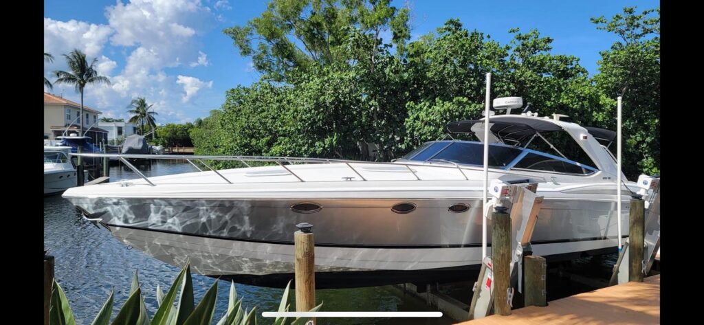 At 40 feet in length with an 11 foot beam, this 400 SS centers on performance and space that allows you to enjoy all that boating was meant to be. The large floor plan allows guests to move around unconfined from the expansive bow to the double seating helm to the wet bar, U shaped lounge aft, swim platform and very large cabin with full head (bathroom).
