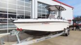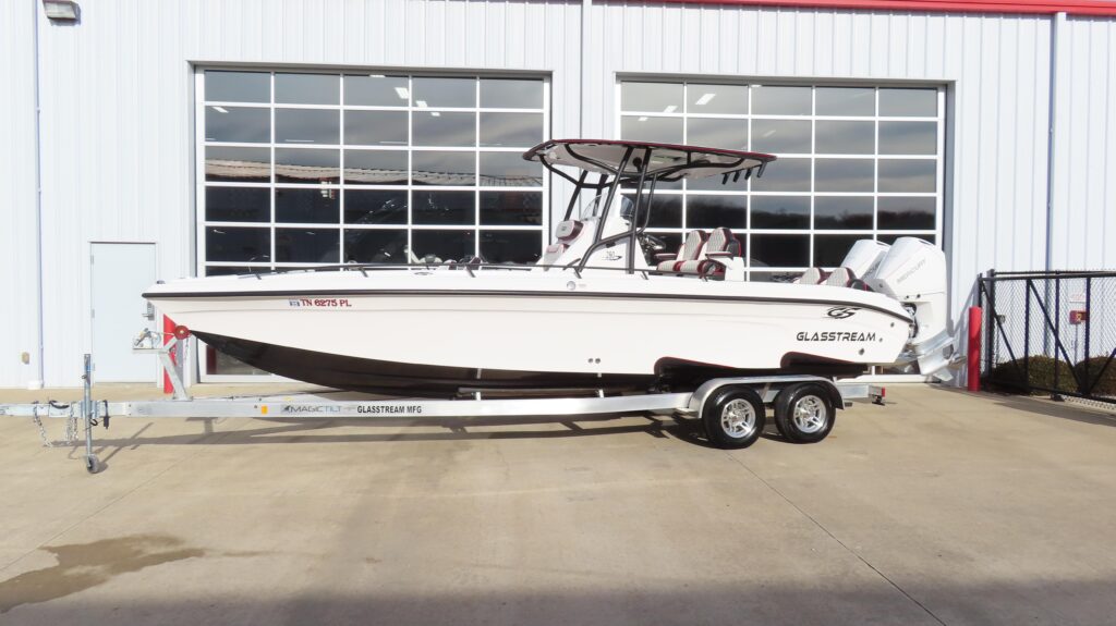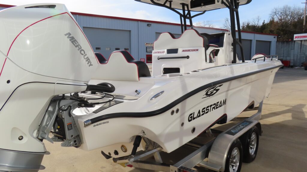 Mercury Vessel View Digital Engine Monitor, Fly by Wire Effortless Shifter, Electric Hydraulic Steering, Dual Engine Batteries and House Battery w/Switches, Fiberglass Hardtop T-Top w/Rod Holders, Black Powder Coated Metalwork, Dual popup Bolster Seat, Forward Seating w/Removable Backrests, Custom White Hexagon Pattern Interior w/ black Carbon Fiber Trim w/ Red accents, JL Audio System w/6 Speakers & 2 Subs, 2 Simrad GPS, LED Cockpit Lighting, Raw Water & Fresh Water, Washdown System, Macerated Head, Pull-up Cleats, Forward In-Deck Macerated Fishbox, Dual Rear Livewells, Electric Trim Tabs, Transom Ladder, Double Axle Aluminum Trailer Incluced.