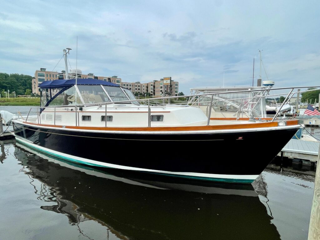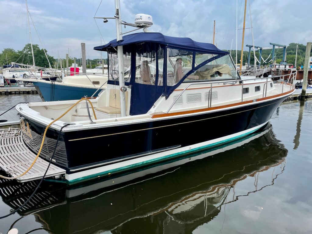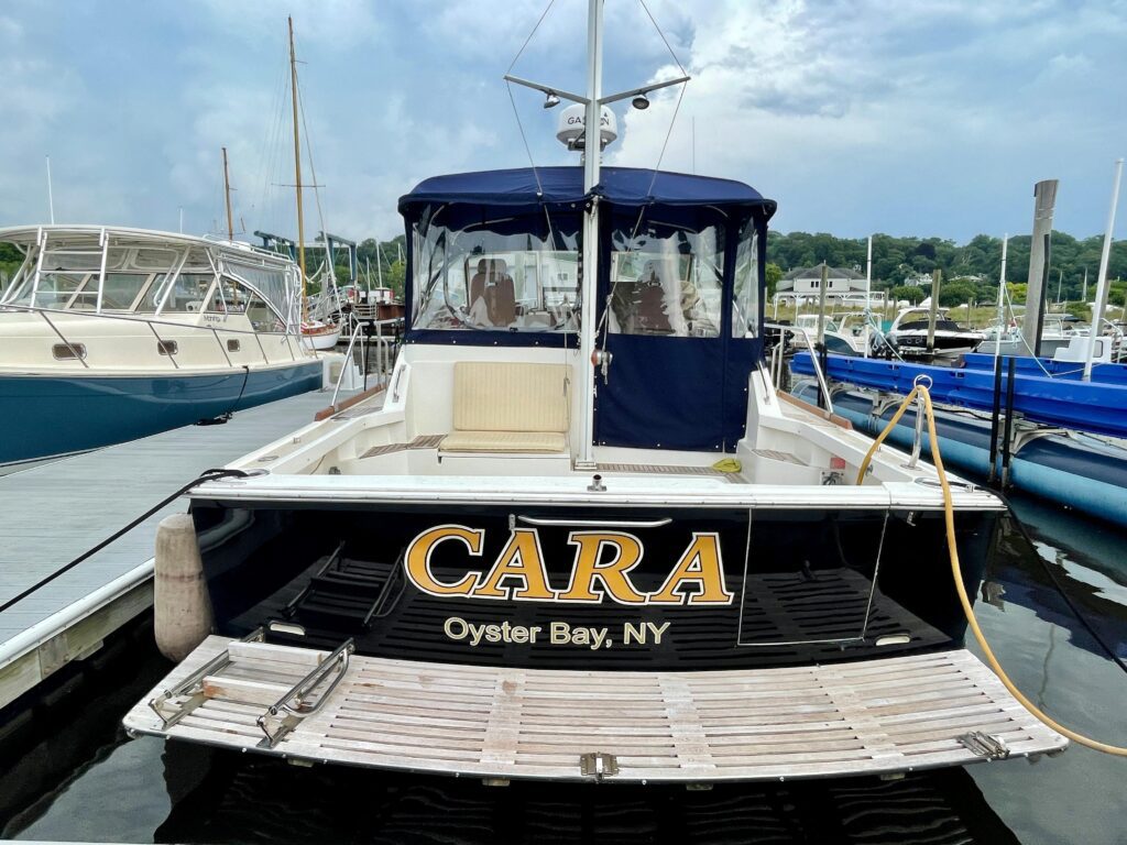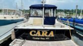 CARA is a well maintained Eastbay 38 with a striking black awlgripped hull, fresh canvas, full cockpit canvas enclsoure, Garmin plotter/radar, generator, air conditioning, autopilot and beautiful new helm and mate chairs. She has had excellent care and it shows. Low hours on her twin Cat 3208’s make this an attractive package.