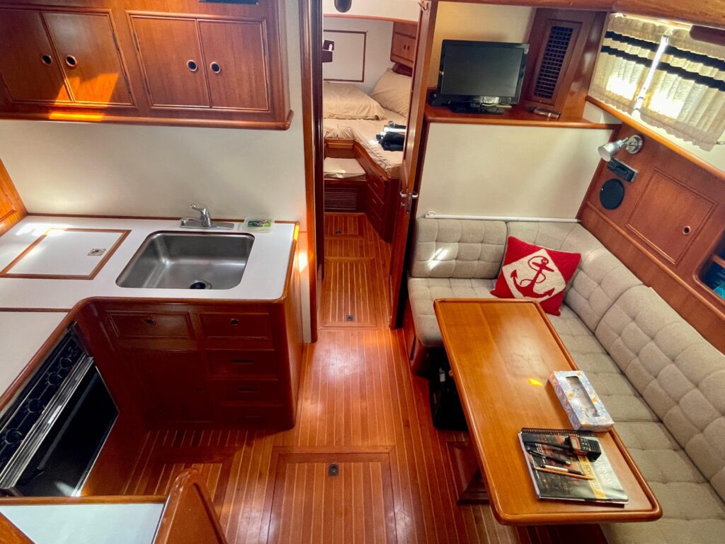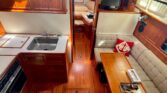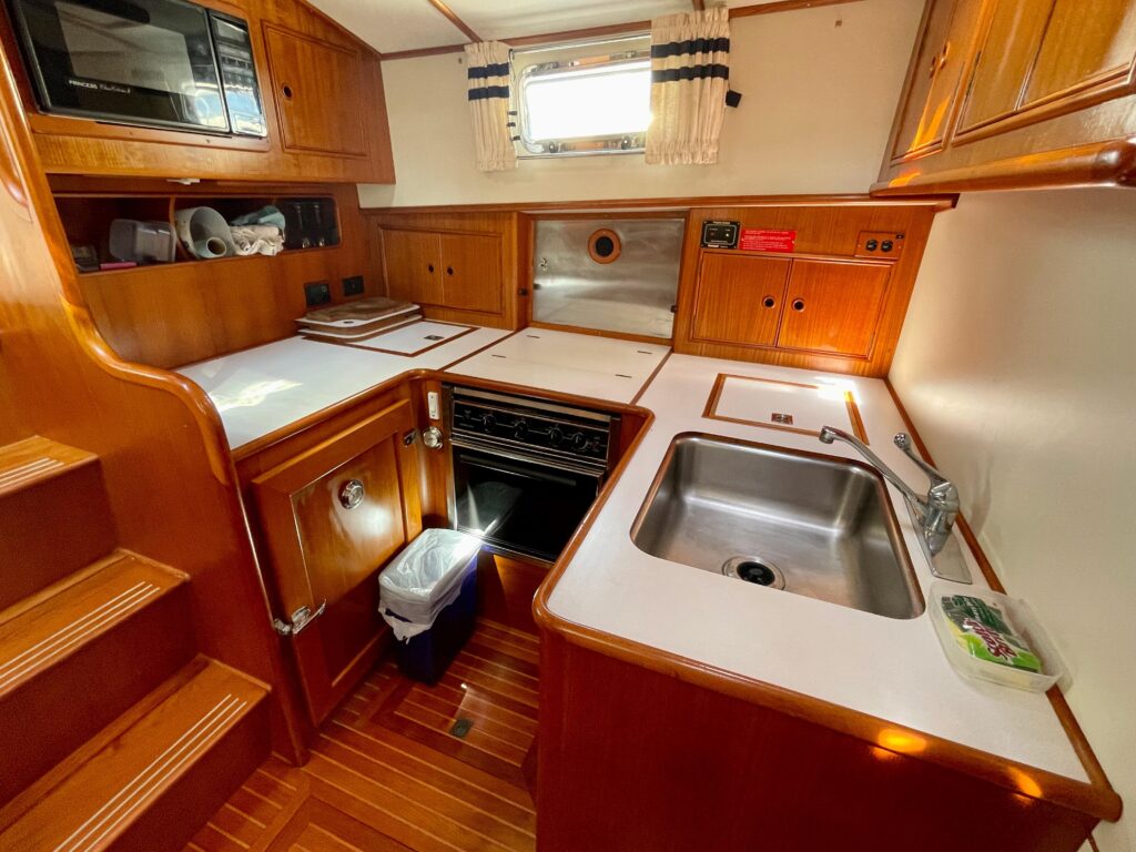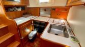 Starting forward is the private Forward Stateroom with full 6′-6″ V-berth with filler, below which there is storage in four drawers and two drop face lockers with some additional “bin type” storage further forward. Above the berth the hull is lined with varnished teak ceilings and is fitted with the optional under deck storage cabinets. Access to the anchor locker is at the forward bulkhead. Aft of the port V is a hanging locker while aft of the starboard V is a bureau with drawers and another locker outboard. Aft and to port is the enclosed Head featuring a Vacuflush W.C. plumbed via a Y valve to the holding tank, molded vanity with integral sink and H&C pressure water, excellent storage in a drawer and several lockers. There is an “en suite shower” which drains to a sump. Continuing aft is the Salon with U shaped settee which converts, when need arises, to a double berth. There is some storage under the settee and behind the seat backs and in lockers and shelves above as well as in another hanging locker forward of the settee. Dining is from a generous varnished teak table which acts as a filler piece when the settee is converted to a berth. Opposite the salon is the U shaped Galley with ample Formica topped counter space fitted with a large single basin stainless steel sink with hot and cold pressure water; generous storage in several lockers and drawers. Cooking is from a Seaward Princess 3 burner Propane stove with oven. Space for refrigerated food stuffs is in a below counter teak front “ice box” fitted with refrigeration.