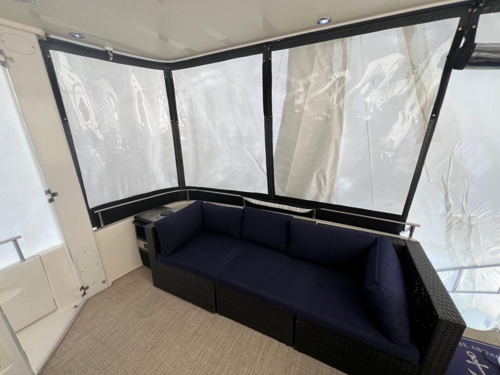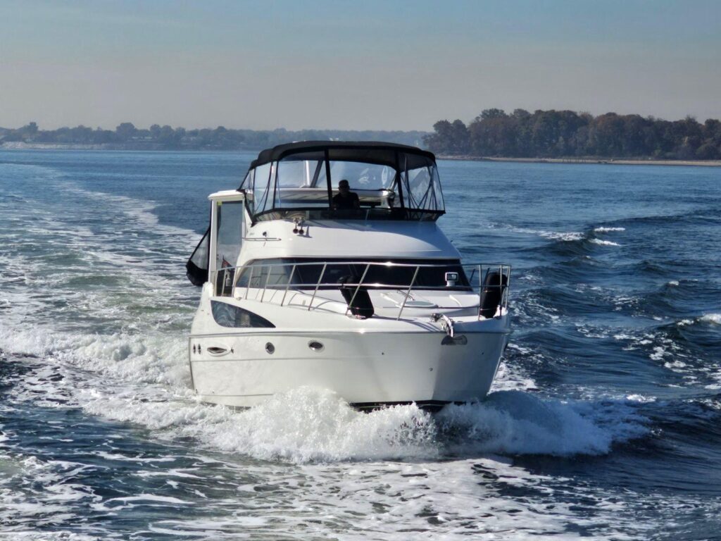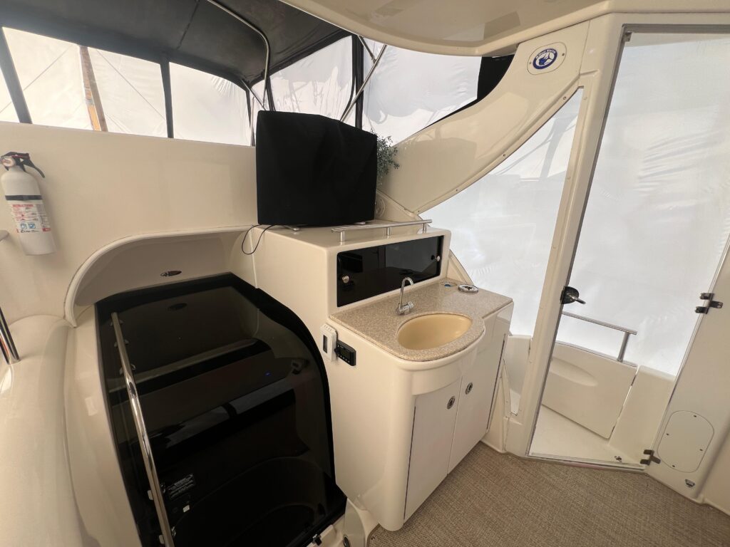 With a hull design that maximizes performance and a deck design that optimizes space, the Meridian 408’s aft cabin configuration has plenty of room for family and friends. Exceptional interior visibility gives everyone views of the magnificent surroundings. A full-beam salon lets you entertain with ease, while the salon media center features a 24-inch television, VCR, AM/FM stereo and CD player to deliver entertainment in style. A forward head can be accessed from the forward stateroom and salon, for use as a day head. A full-beam master stateroom with regular queen innerspring mattress lets you sleep in luxurious comfort.