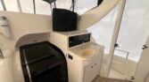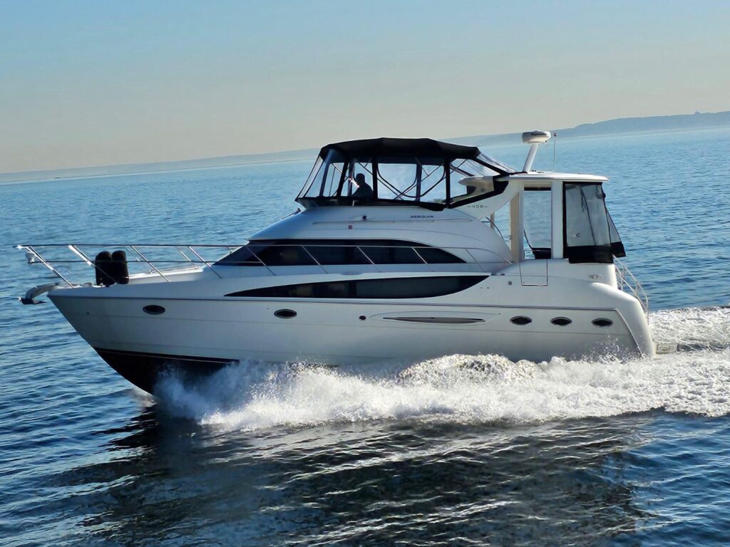 With a hull design that maximizes performance and a deck design that optimizes space, the Meridian 408’s aft cabin configuration has plenty of room for family and friends. Exceptional interior visibility gives everyone views of the magnificent surroundings. A full-beam salon lets you entertain with ease, while the salon media center features a 24-inch television, VCR, AM/FM stereo and CD player to deliver entertainment in style. A forward head can be accessed from the forward stateroom and salon, for use as a day head. A full-beam master stateroom with regular queen innerspring mattress lets you sleep in luxurious comfort.