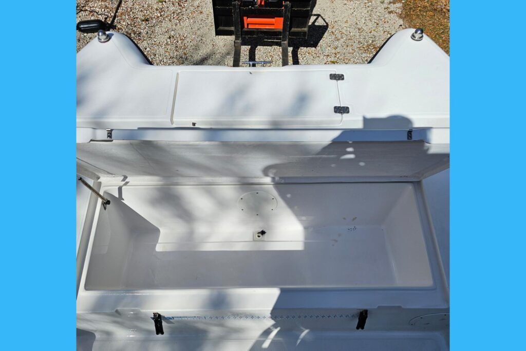 Slippery Bunk has a live well, 3 tackle storage compartments, 4 rocket launchers, 4 gunwale rod holders, and 4 additional rail mount rod holders. There are also 3 lightweight rod holders mounted to the backside of transom. It has a mammoth fish box in the bow with another small storage area under the seat in front of the center console, anchor with 100′ of anchorline, marine radio new in 2022 in center console dry box with external speaker. It has a transom tuna door and there are bilge pumps in each sponson. It is equipped with fore and aft spreader lights and a navigation compass. Lenco trim tabs are installed.