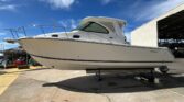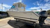 Hardtop w/spreader lights, four (4) rod holders across back, four (4) rod holders on stanchions (2 port, 2 stbd), handrails, four (4) speakers, LED lights & canvas storage pouch for PFD’s