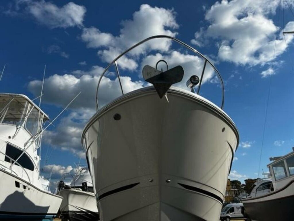 The bow is accessed via centerline steps molded into cabin entry door. Once through the openable windshield access door, you will find a non-skid surface leading you to a forward bow lounger for two trimmed in Sunbrella fabric. Forward of that area you will find the bow pulpit area with a power windlass with foot controls, and an anchor locker. A powered remote-controlled spotlight is also located in this area.