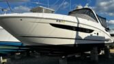 The helm is equipped for full control while underway. Electronic shift/throttle controls, full analog instrumentation, MerCruiser Vessel view4 systems monitor, Ray Marine E127 hybrid touch screen chart plotter/radar/fish finder, Ray Marine VHF radio, Ray Marine auto pilot, remote stereo controls, remote spotlight, and a factory installed bow thruster.