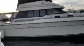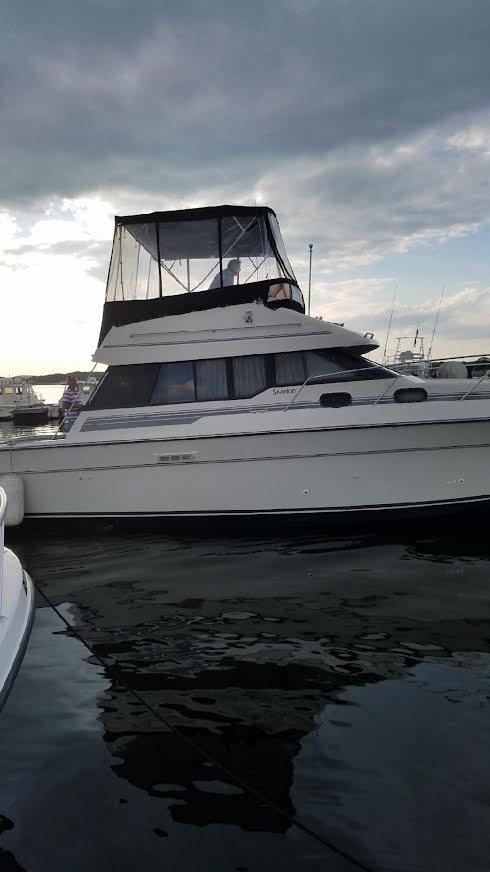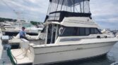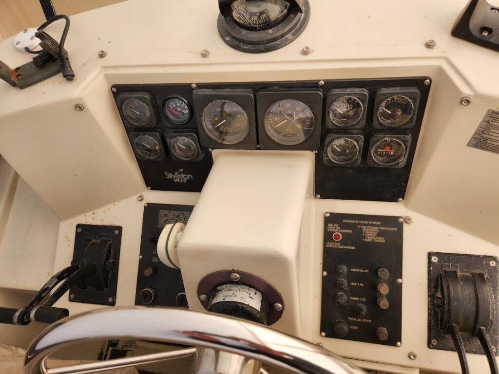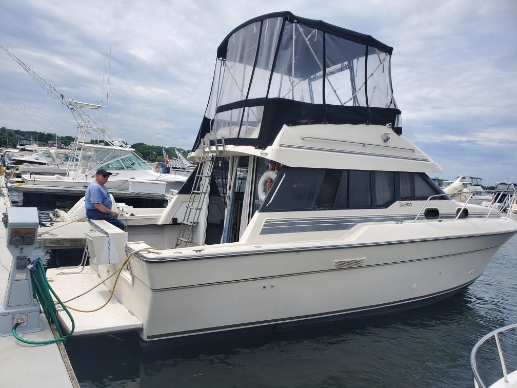 Very well maintained, clean lines, good looks, excellent versatility and an attractive price combine to make this 34′ Convertible an extremely good buy. Beautiful, well equipped 1989 34′ Silverton, Convertible. Equipment & features include 12,000 BTU reverse cycle air conditioning, salon sleep sofa, sleeping accommodations for six persons, Newer 740s Garmin GPS and Fishfinder, full enclosure, (with newer panels) newly installed gray Silverton Sea Deck in cockpit, new custom padded cockpit bolsters, rod holders , hot water heater, (2021) bright light oak interior paneling, accents and cabinetry, new window curtains and more. Powered by twin fresh water cooled Crusader 454/350 HP CID Gas Inboards with 1075 hours. Port engine rebuilt and has 240 hours of running time, She will cruise about 18-19 knots. Upgrades include new hoses, fan belts, Accommodations include a single stateroom queen berth layout floor-plan with a full size galley down and dinette which is completely open to the salon. She features 360 degree wraparound windows with upgraded curtains and window coverings, which create a spacious bright and inviting interior. There is a enclosed head with separate shower stall. The cockpit is large enough for a several anglers or guests. The bridge is arranged with bench seating right of the helm. The helm is to starboard with two adjustable and swivel helm chairs. Her engine room is extremely clean and well organized. Note “No Anchor Windlass” Her engines run excellent and she is turn key ready. Offers Encouraged” Excludes all personal items.