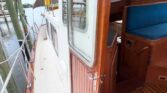 Going forward, the stairs to the pilothouse lift for access to the starboard side of the engine room, with a short ladder leading into this space. Going up leads to a raised observation lounge with settee and rectangular table. This offers passengers a commanding view through three windshield panes, each fitted with a windshield wiper. Rear windows provide views to the stern. The pilothouse has an instrument console sufficiently large to accommodate the navigation displays, engine controls, bow thruster controls and electronics, with the ship’s AC AND DC panel just below. A large chart table adjacent to the console hinges upward for access to a chart and document storage compartment.