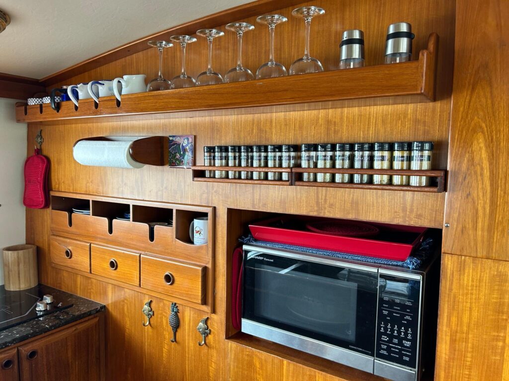 Convenient boarding is provided by port and starboard gates that open directly in front of the port or starboard sliding pilothouse doors. High gunwales protect the walkways leading from bow to stern. The aft deck has access to the salon and access to the flybridge above. The upper helm station has a double-wide bench seat with engine controls, Raymarine multifunction display (GPS) repeater, depth gauge, remote autopilot and compass. The propane grill and a hoist are also on this level.