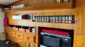 Upon entering the salon, one is surprised by the spaciousness of the L-shaped seating and dining area with a full length settee opposite. The dining table can be lowered to make a double bed. The galley is well appointed with ample cabinet and drawer storage above and below. Slide out storage is provided for pots and pans and the trash container. The two burner Force 10 electric stove and the microwave/convection oven have the cooking needs covered. Opposite the granite counter with deep double stainless steel sinks is another counter with TV above and Isotherm refrigerator/freezer below. Next to the refrigerator is a food pantry with sliding shelves.