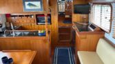 With an appealing classical look, the hull has a sheer line rising from a slightly curved transom toward a moderately raked bow. She rides on a solid fiberglass semi-displacement hull with a relatively wide beam, flat aftersections, and a deep prop-protecting keel. The cored superstructure is crowned by a flybridge coaming that defines the upper helm station, and the flybridge extends sternward. This is an extended-range, live-aboard design with traditional styling within.