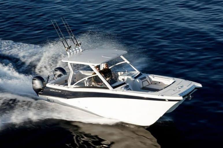 Aggressive bow styling with integrated LED docking lights, surrounding fascia, and World Cat lettering